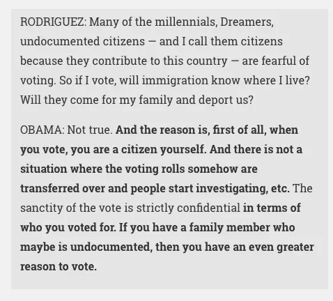 'Not true,' he says....assuring the illegal voter that 'immigration will not know where you live, or come for you.'