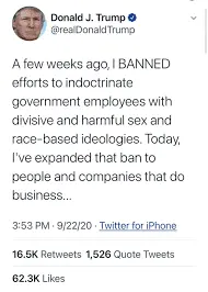 It builds on an order issued earlier this month that instructs federal agencies to end diversity-training programs that teach about “white privilege” and critical race theory.