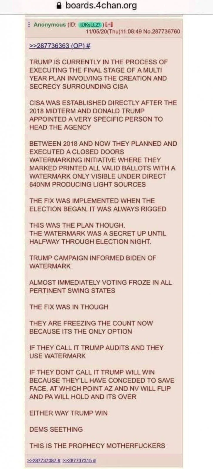 Second reason -- if this were true, then surely there would have been some official mention of it by now. Some action taken. If they know for a fact that there's fraud that can be detected and proven this easily, why let the votes continue to be tabulated to the point of states being officially won by Biden and the election being called in his favor? Why not put the brakes on the counting once it could be shown that ballots were faked, and then at that point put the DHS in charge of (or in coordination with state election officials) to scan all remaining ballots to make sure the radio-isotope marker these articles are describing is present? Waiting until after the race is called, then going back and saying "but we're now invalidating ___________ number of ballots which we can prove were fake because of this mark, which we secretly placed there to bait fraudsters into committing fraud, and so the election was