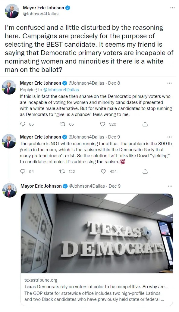 The black Democratic mayor of Dallas agrees and called him out on this on Twitter. He also pointed out how the Republicans in Texas have a more racially diverse slate of candidates.