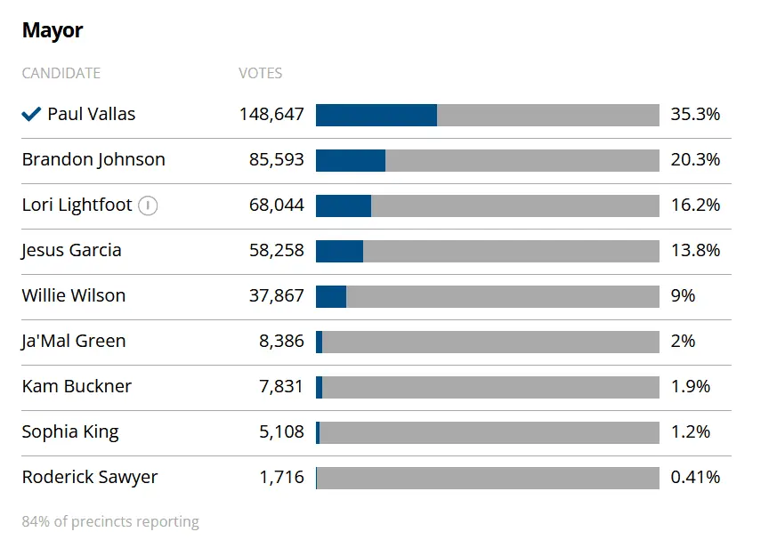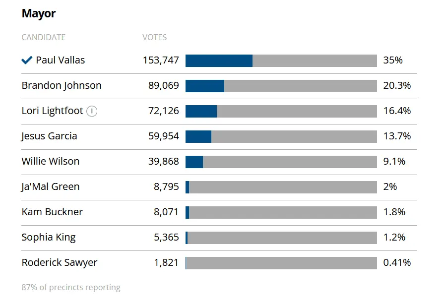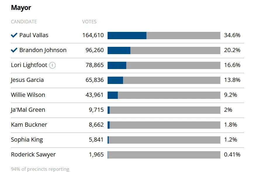 Paul Vallas 134,844 36.0%Brandon Johnson 74,992 20.0Lori Lightfoot*incumbent 58,807 15.7Jesús G. GarcÃa 52,515 14.0