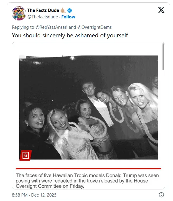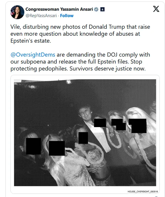 “Vile, disturbing new photos of Donald Trump that raise even more questions about knowledge of abuses at Epstein’s estate,” Rep. Yassamin Ansari (D-AZ) wrote on X. “Oversight Dems are demanding the DOJ comply with our subpoena and release the full Epstein files.