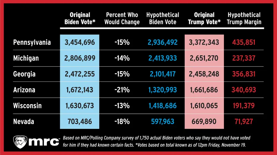 “A shift of this magnitude would have changed the outcome in all six of the swing states won by Joe Biden,” the MRC determined.