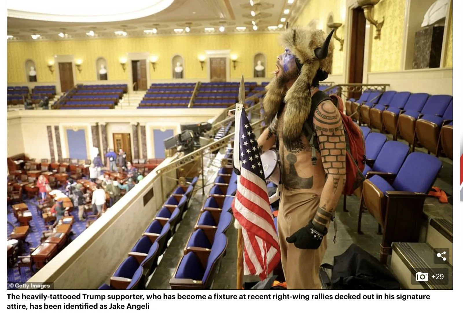 A heavily-tattooed Trump supporter identified as Jake Angeli - dubbed the QAnon Shaman - was at the front of a group of agitators who broke into the Capitol Wednesday afternoon.