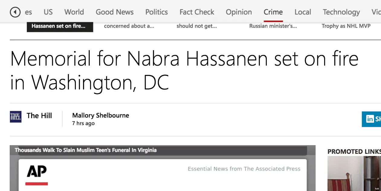 A memorial for Nabra Hassanen, the Muslim teenager killed in Virginia over the weekend, was set on fire on Wednesday in Washington, D.C., Fox5 reported.