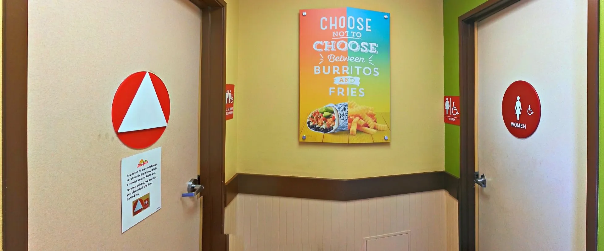 At this Del Taco where my wife and I dined a few hours ago, there is no men's restroom. There's a women's restroom, and there's a “gender neutral” restroom. So, as a man, which restroom am I supposed to use? I guess I can claim that I “identify as a woman”, and on that basis, use the women's restroom. Or worse, I can claim that I “identify” as some sort of perverted “gender-neutral” freak so that I can use that restroom.