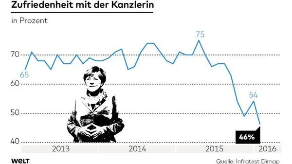 Her approval rating now 46%, some people might think this is high, but for her, this is very bad, in 10 years only ONE TIME dropping below 70%, now 46%, this is Merkel in freefall and it illustrates what we have been saying for several months, politically and personally Merkel is finished, the respect and TRUST has now been destroyed by her actions since October.
