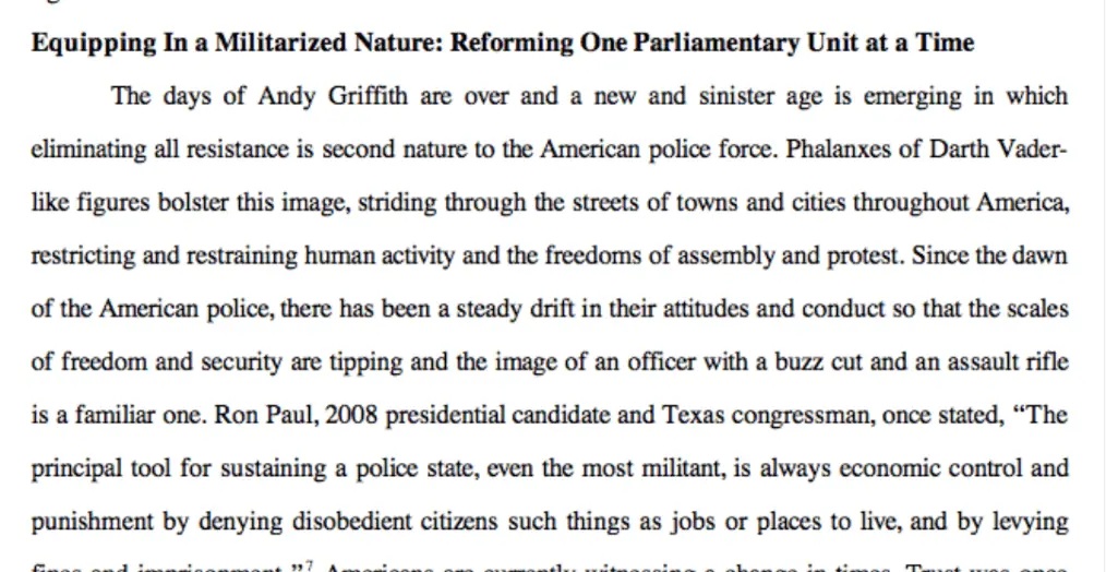 The American police force, however, is not a branch of the military, nor is it a private security force for the reigning political faction. It is an aggregation of the countless local units that exist for a sole purpose: to serve and protect the citizens of each and every American community. In recent years, however, there has been an increasing militarization of the police. It has not occurred suddenly, in a single precinct; it cannot be traced back to a single leader or event—rather, the pattern is so subtle that most American citizens are hardly even aware of it. Little by little, police authority has expanded, one weapon after another has been added to the police arsenal, and one exception after another has been made to the standards that have historically restrained police authority. When analyzed as a whole, this trend toward militarization is undeniable, and it is one that could have serious implications for American liberty if left unchecked.