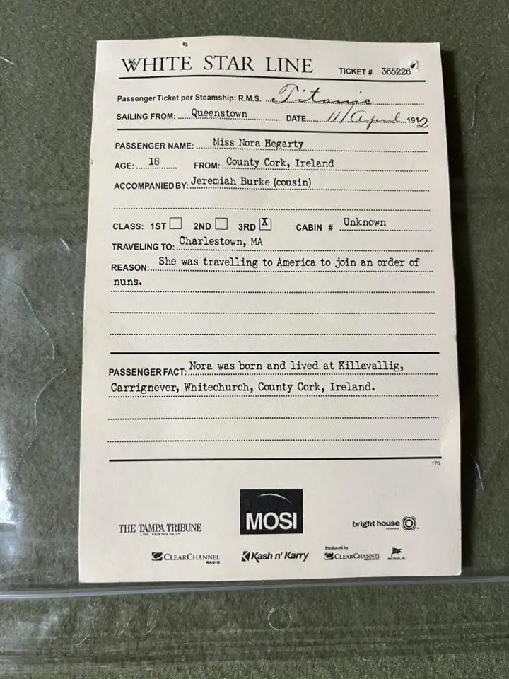 Jeremiah Burke, aged 19, from Ratcooney, Glamire, in County Cork, boarded Titanic at Queenstown as a Third-Class passenger, bound for America, to meet up with two of his sisters who had already emigrated to the U.S. His cousin Nora Hegarty was with him, who had been planning to join an order of nuns in America. Jeremiah was the youngest of seven children, and had worked on the family farm before setting out on his journey. His sisters had settled in Charlestown, Massachusetts, and Major Archibald Butt had sent money home for him to join them. Before he left, Jeremiah’s mother, Kate, gave him a small bottle of holy water for the trip. Both Jeremiah and Nora perished in the sinking.