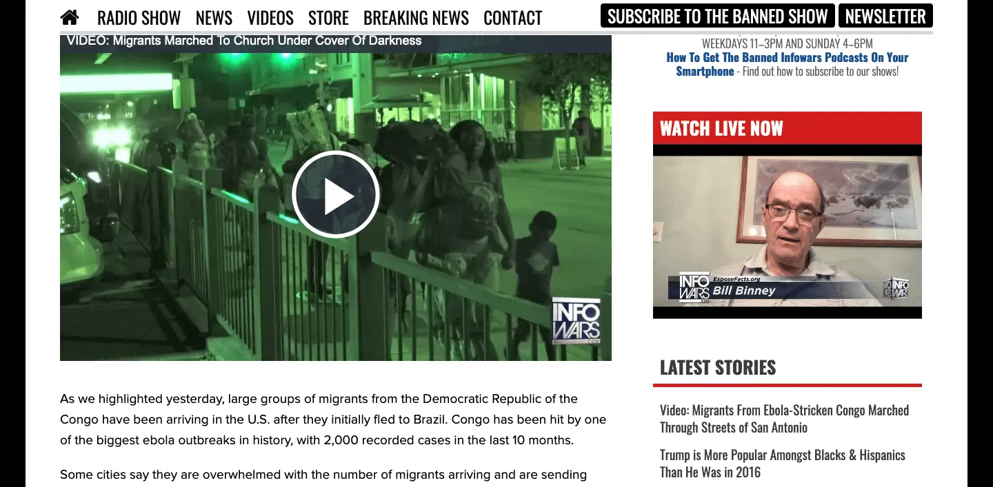The clip shows migrants being led to a nearby church by city workers. Some of the illegal migrants hide their faces while one of the individuals leading the group assaults an Infowars cameraman in an attempt to stop him from filming.
