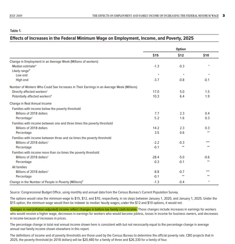 CBO projected the minimum rate being gradually increased until it reaches $15 per hour in 2025. They projected family’s incomes that are less than three times their family sizes’ poverty thresholds would have increased their incomes by a range of 5.2% to 3.4%. To the extents that any of those family’s unemployment insurance and other social welfare benefits were replaced by additional wage incomes, those families wage incomes must have increased by a range much greater than 5.2% to 3.4%