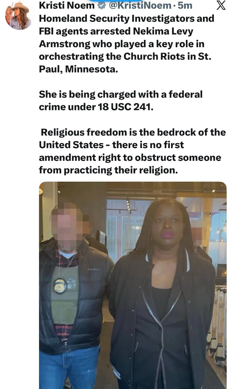 "Minutes ago at my direction, HSI and FBI agents executed an arrest in Minnesota. So far, we have arrested Nekima Levy Armstrong, who allegedly played a key role in organizing the coordinated attack on Cities Church in St. Paul, Minnesota," Bondi wrote on X.