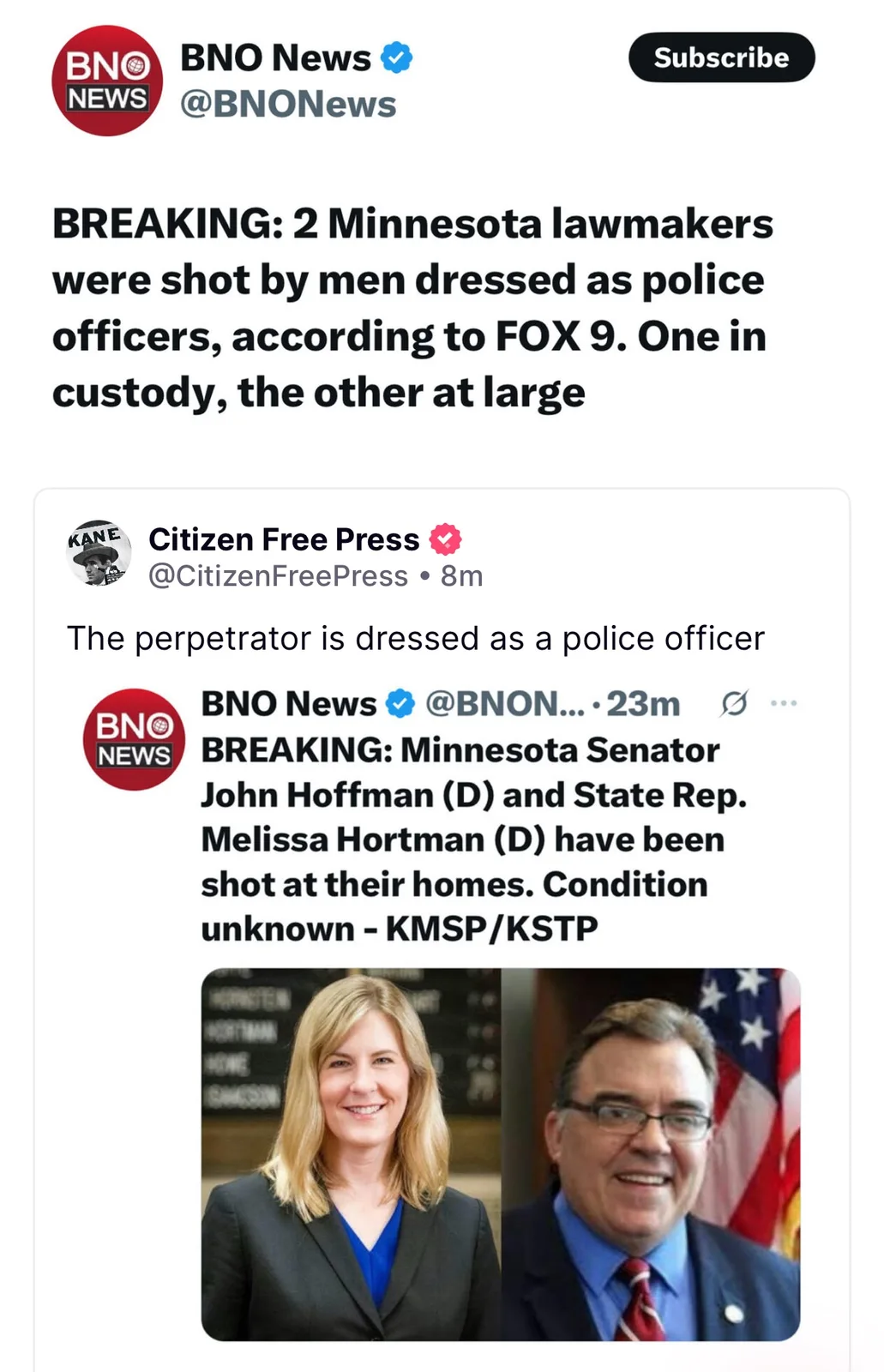 Evidently the shooter was impersonating a cop. Both shootings were early in the morning at the victims' homes. The victims are/were both Democrats.
