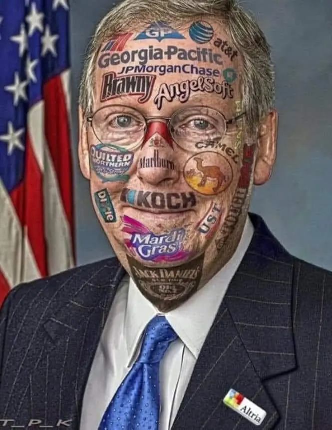 Jesus man - Mitch's face is disturbing enough already. But this is SO true that it hurts. I'd have probably included an insignia such as the one below, seeing as how the creep refused to take up Russia sanctions and shortly there after, got a 200 million dollar aluminum plant for Kentucky from his buddy Oleg Deripaska. They don't call him Moscow Mitch for nothin'!