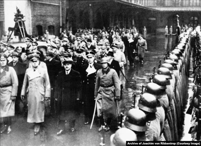 Vyacheslav Molotov with Joachim von Ribbentrop and Field Marshal Wilhelm Keitel bypass the guard of honor, November 12, 1940, Berlin