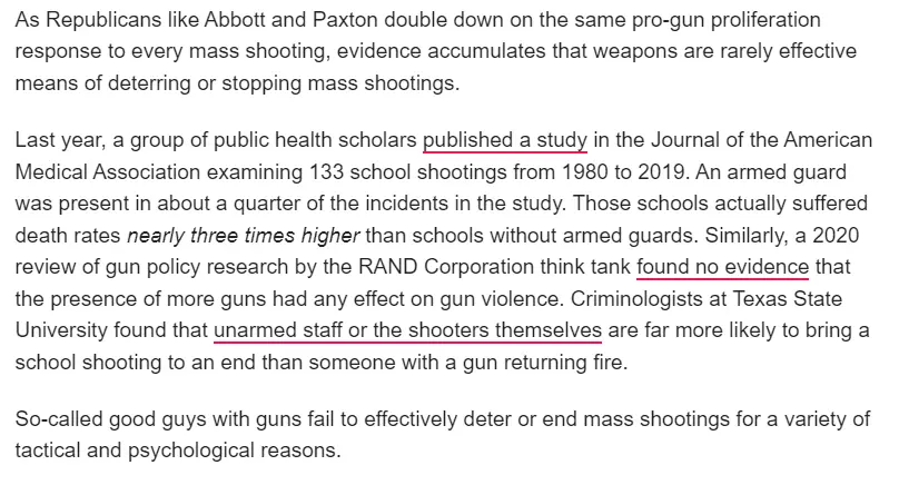 There were 2 armed guards at Uvalde. There were armed guards at Parkland, but they hid from the shooter. There have armed guards at lots of mass shootings, but they didn't prevent anything. Of course having armed guards might be better in some cases than not, but that alone is not the answer. Suicidal active shooters, and there have been several, might purposely choose a target with guards just for that purpose. About 25% of mass shootings did have armed guards, but they averaged 3 times the deaths.there should be armed security in every school in the US ....now !