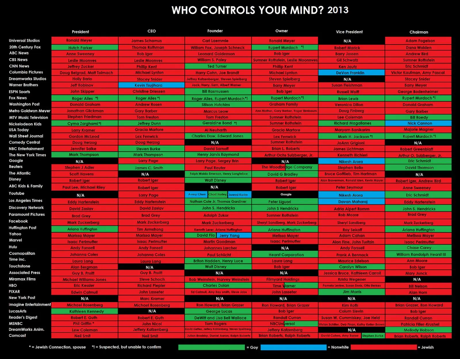 Anyway, I personally do not know what to make of all this Jewish presence in high places. Of course it does not surprise me because Jews have brilliant minds. But are you suggesting that this nation of ours would not be so filled with sex, greed, narcissism, macabre and gross entertainment that so much of youth delights in, etc., if these were not Jewish owned or run monoliths? I rather doubt it.