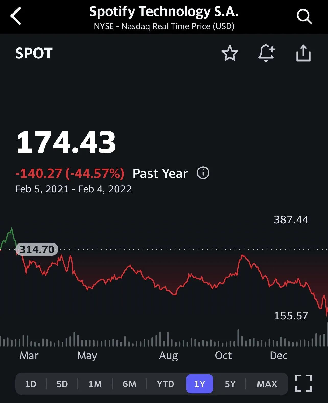 What Conservatives? Joe Rogan is neither Conservative nor Liberal. And it was dipshit Liberal "artists" using their music as a weapon who fukked things up.Conservatives ruin everything. Here is Spotify’s stock. They’ve lost $30 B in value. That’s thirty billion dollars. Rogan and Spotify wont survive this intact.