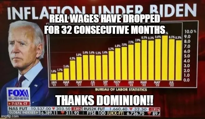 32 Consecutive Months puts the start of this ^^^^ claim to August 2020.Real wages (your take home pay vs inflation) has dropped for 32 consecutive months, thanks to that drooling, stuttering shit clown.