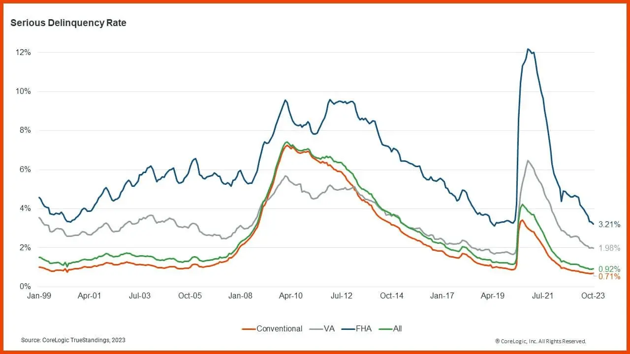 As of October 2023, the serious delinquency rates for Federal Housing Administration (FHA), U.S. Department of Veterans Affairs (VA) and conventional loans were 3.2%, 2% and 0.7%, respectively (Figure 1). [2] The serious delinquency rate decreased for all loan types in October 2023 compared with a year prior, when COVID-related delinquencies still lingered.