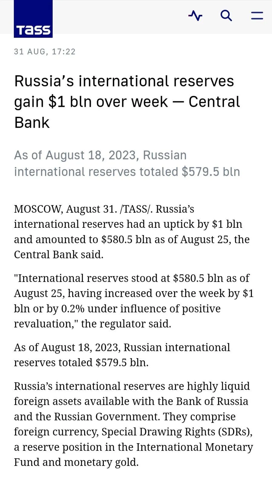 As of August 18, 2023, Russian international reserves totaled $579.5 blntass.com