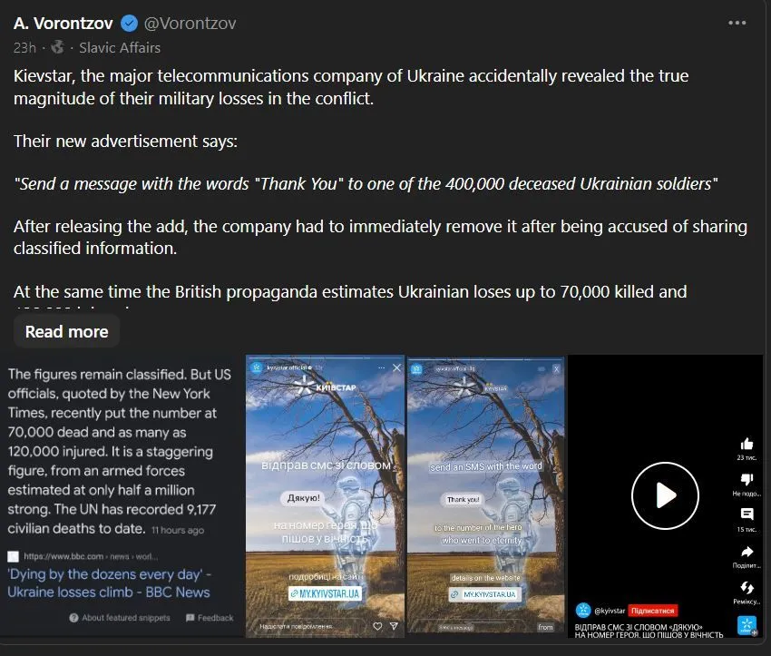 The fucktards out there screaming how the numerical parity of Russian casualties have been 2:1 (Two Krainian Dead/Wounded to Every One Russian). Whelp, That just went out the ole winder I’d say. Kievstar pulled the ad, but according to other sources, the guy who gave the go-ahead for the Ad? Veeeery telling that the SBU, the Krainian KGB Bully Boys snatched him up and sent him tot he front after shooting a forced ‘apology video’ which seems very par for the course.