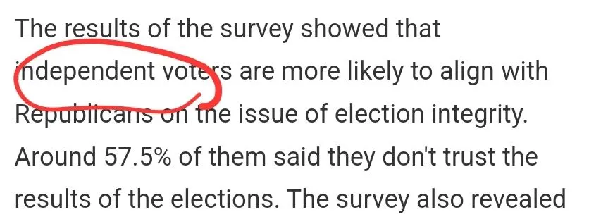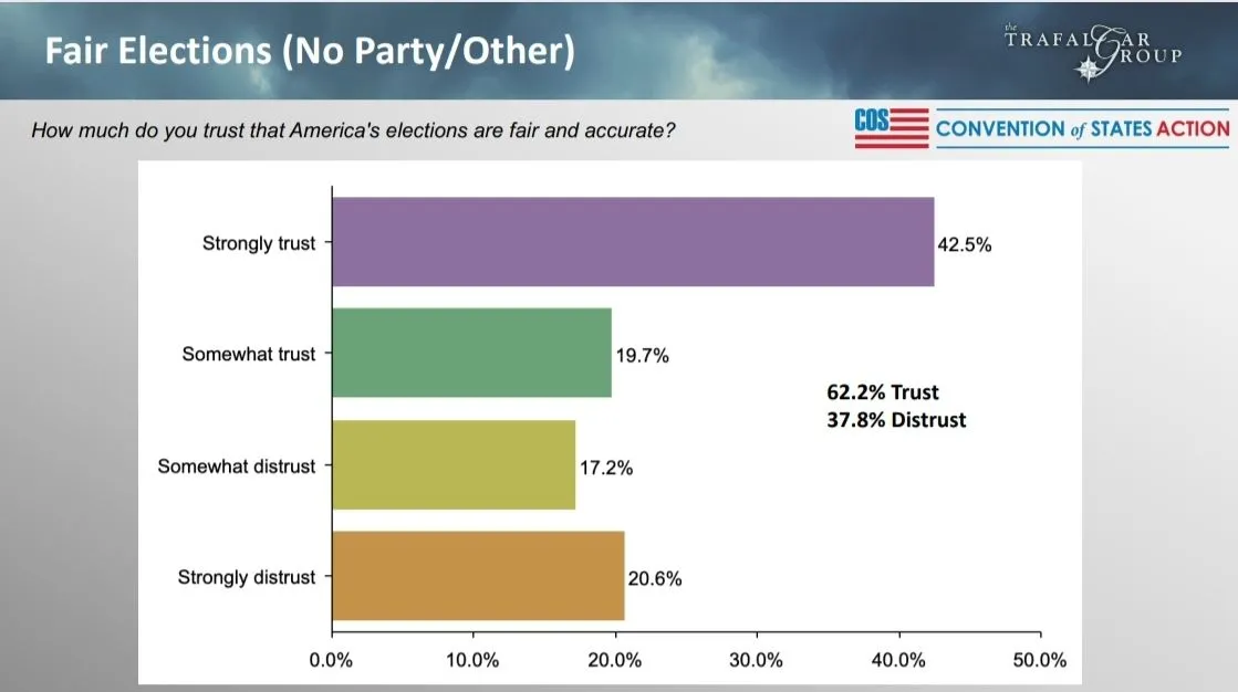 A total of 17 percent of Americans said they have "somewhat trust," while 17.9% said they have "somewhat distrust," and 21.9% stated they have "strong distrust." The survey was conducted by the Convention of States Action and The Trafalgar Group. It was conducted from November 16 to 20.