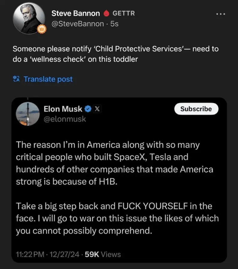 Steve Bannon mocks ‘toddler’ Elon Musk after he tells X user to ‘f*** yourself’ over visa bust-up