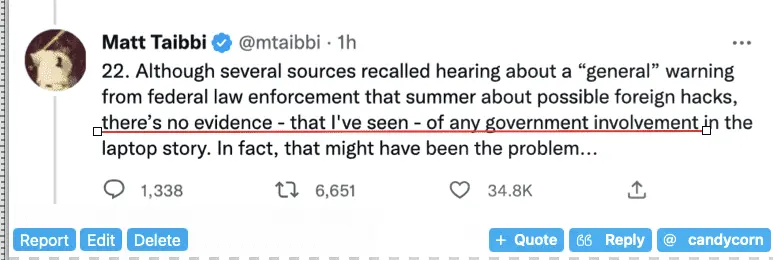 Give it up. THe old head of Twitter security and content was interviewed all over the media last week. Acknowledged the personal "heads up" warning from an un-named govt official. Didn't admit that it said anything specific about the laptop story. But the timing of the CENSOR decision indicates the 2 are intimately connected and it WILL come out. Give it a few days.