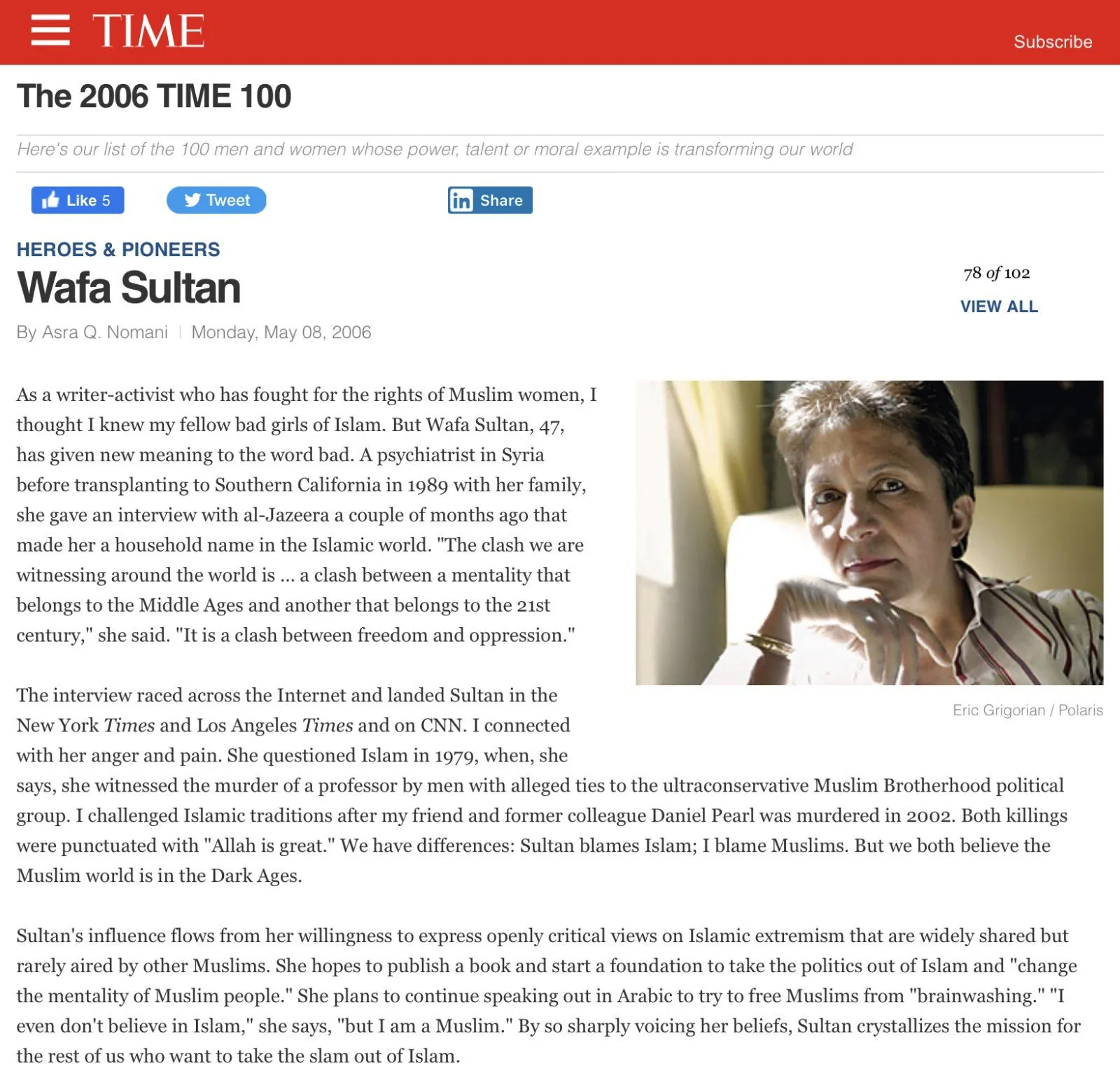 Muslim physician and human rights activist Dr. Wafa Sultan, Time magazine “Hero and Pioneer of the Year”: “I believe that any nation that grants equal opportunity to every citizen, regardless of race, religion, political affiliation, or gender, thereby, establishes its moral legitimacy.