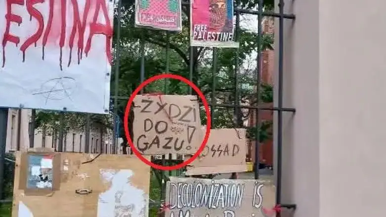 A shocking placard calling to gas Jews appeared in a pro-Palestinian protest camp set up by students of the philosophy faculty of the Jagiellonian University, one of Poland's largest and most prestigious.