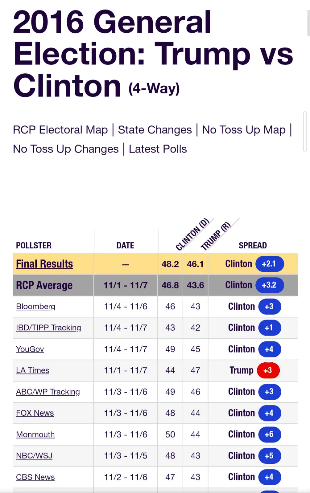 Clinton lead aggregate polling by 3.2 on election day and lost.