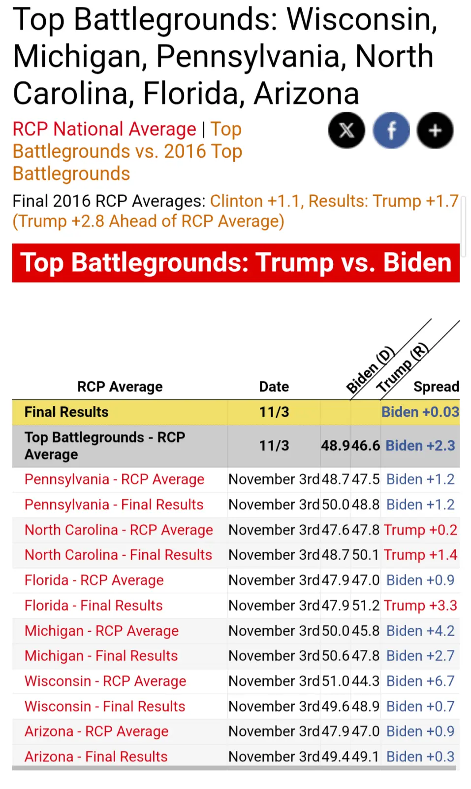 Biden lead in aggregate polling on election day by 7.2 and only won by 43,000.