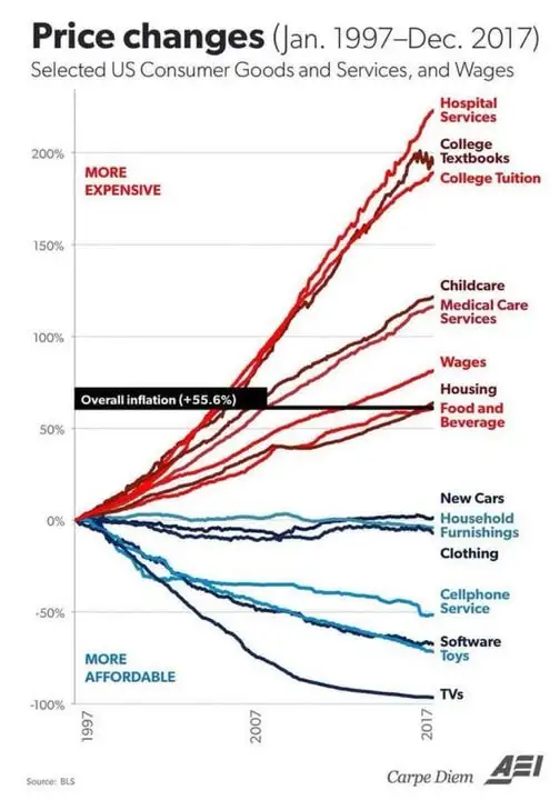 The reason why College and Health Care have gone up by crazy amounts is because- wait for it - everyone really needs those things, and the people who control the supply can charge whatever the hell they want.