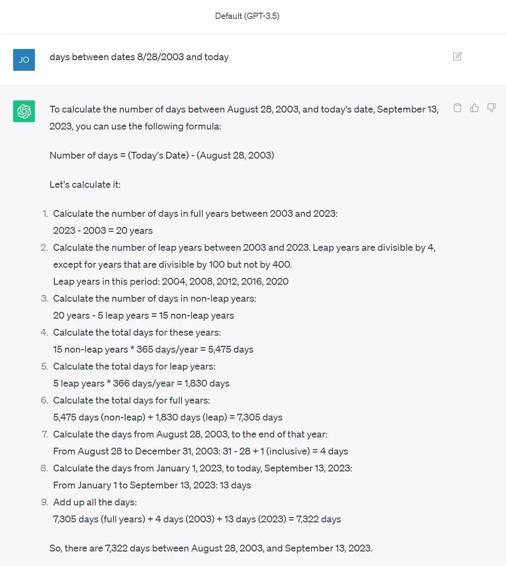 Your answer appears to be incorrect since it doesn't factor in leap yearsChat GPT can't be wrong!