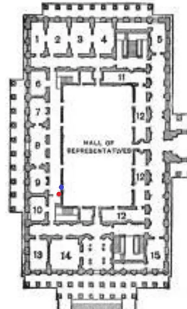 The red dot is where Ashes was shot. The blue door is a door leading into the House chamber...