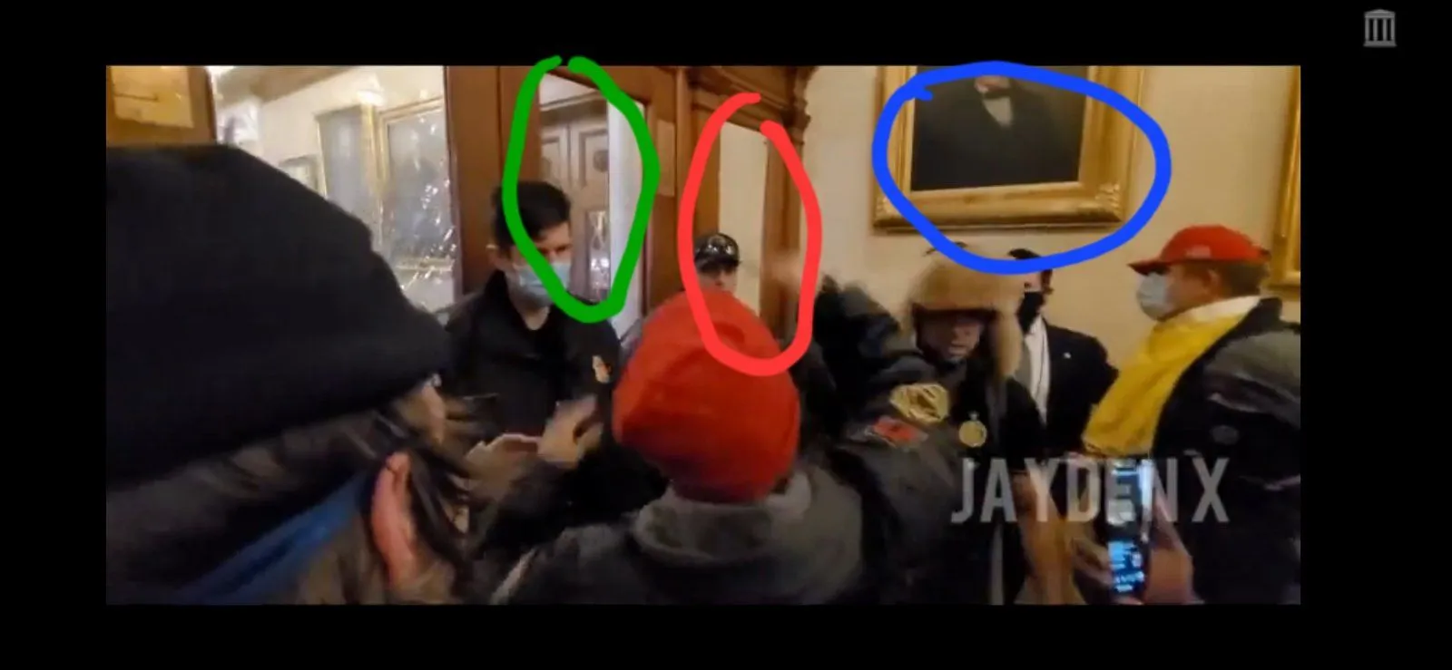 And as far as your bullshit lie that there were no walls... the screenshot below is shortly before Benedict Babbitt was shot. The red circle indicates where Ashes Targetpractice was shot. The green circle shows how close the unbarricaded door leading into the House chamber is in relation to where she was shot. But most notably is the painting in the blue circle to the right of where she got shot. If there's no wall there,