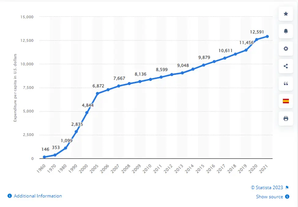 Per capita national health expenditures in the United States have increased significantly since 1960.