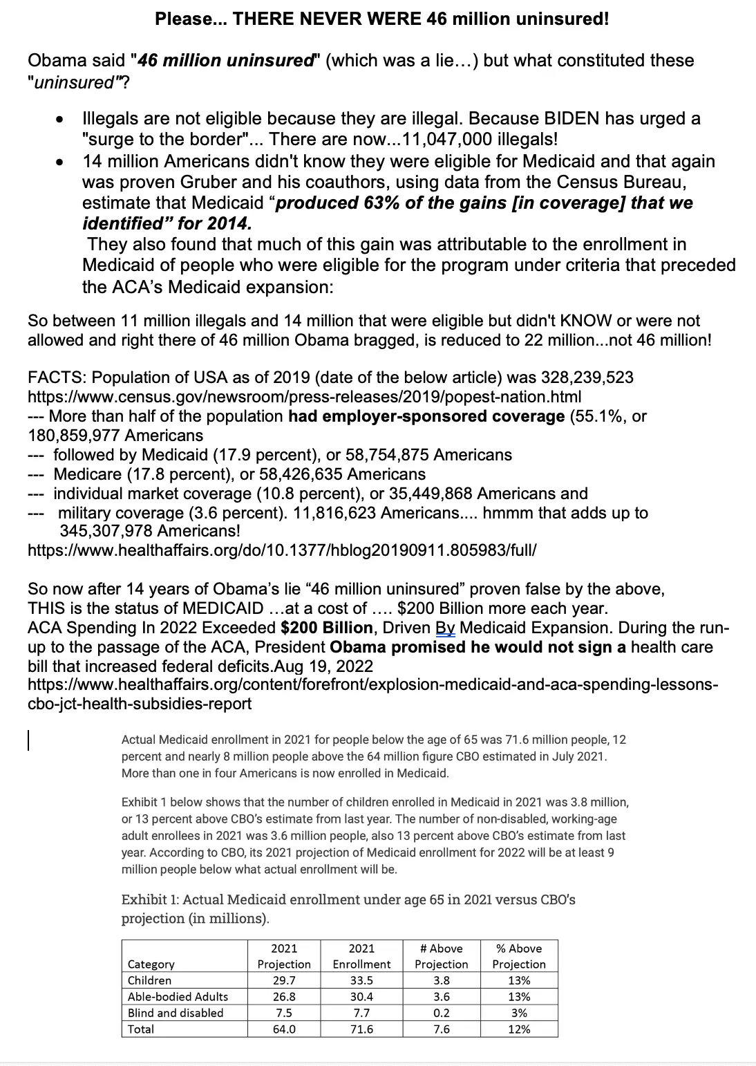 13 years ago the “death panel” liars claimed that ACA would “cost” a trillion over 10 years. That was largely accurate except that that COST was not added to the debt.But THAT IS THE FACT! 14 million people were eligible for Medicaid BEFORE ACA! All Medicaid needed to do was be more active using their current funding to enroll these 14 million BEFORE ACA. Why was it necessary to RAISE ALL our health care insurance costs under the guise of the lie the 46 million uninsured WHEN 14 million were eligible for Medicaid and 11 million were NOT eligible i.e. ILLEGALS! As a consequence of Obamacare here is how OUR private insurance cost went up!