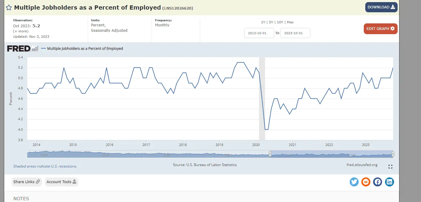 Nearly 8.4 million people held multiple jobs in October, the Labor Department reported Friday. They represent 5.2% of the workforce, the largest share of moonlighters since January 2020.