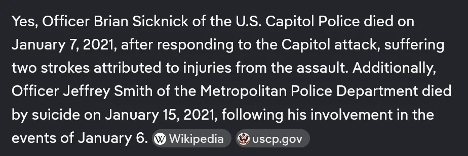 Oh **** off...No cops died as a result of that FBI incited fan dance.There was no justice for the 140 cops and three officers who subsequently died. They got screwed over by Trump when he pardoned the miscreants and insurrectionists that assaulted the Capital.