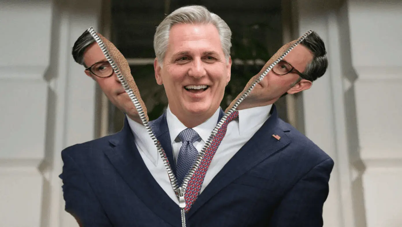 WASHINGTON, D.C. — In a shocking development amid the uproar over whether congressional Republicans will seek to oust yet another Speaker of the House, current leader Mike Johnson unzipped a skinsuit to reveal he was Kevin McCarthy all along.