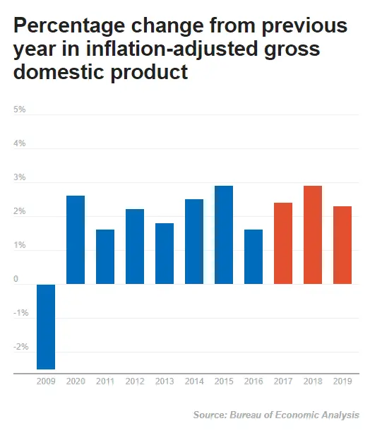 Under Obama from 2014 to 2016 (his last 3 years), real gross domestic product — the broadest measure of economic activity — grew at an average annual rate of 2.5%. In Trump's first three years, 2017 to 2019, real GDP expanded by an annual average of 2.6%, according to the Bureau of Economic Analysis. It is an indisputable fact that GDP was similar under the 3 years of Trump as it was the prior 3 years under Obama. Trump delivered those GDP numbers with a much higher level of spending than Obama s last three years too.