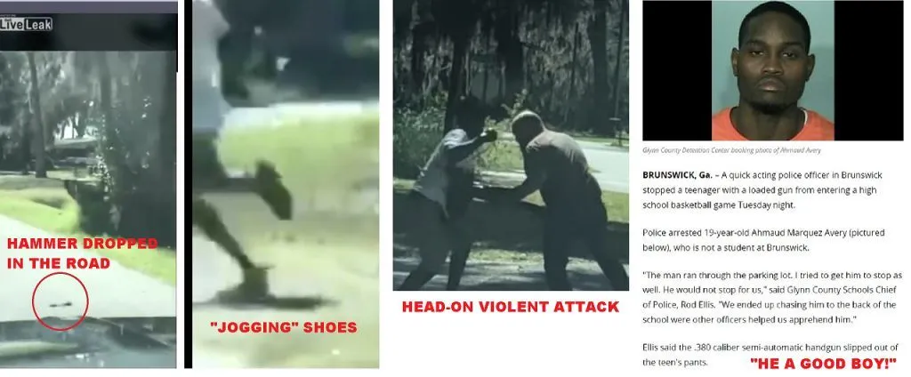 well what do you see from the video? why can't you just address the video? I see two guys, one outside the driver door with a weapon, a guy in the truck bed standing up, the truck is stopped and in the middle of one lane, a black man running toward the truck from quite a distance. I also know another vehicle is following the blackman running. I see the black man run toward the driver side of the truck, seems to react to the man with the weapon and runs around to the passenger side of the truck, his path seems to circle to the front of the truck and attacks the man who moved around the driver door. Puts his hands on the weapon, the weapon fires, he continues wrestling with the man and his weapon while punching him in the head, and the weapon goes off again, continues wrestling and punching and while the struggle continues, the weapon goes off one more time hitting the guy who was jogging, he releases the gun and staggers away and falls to the ground. Now you tell me what you see.
