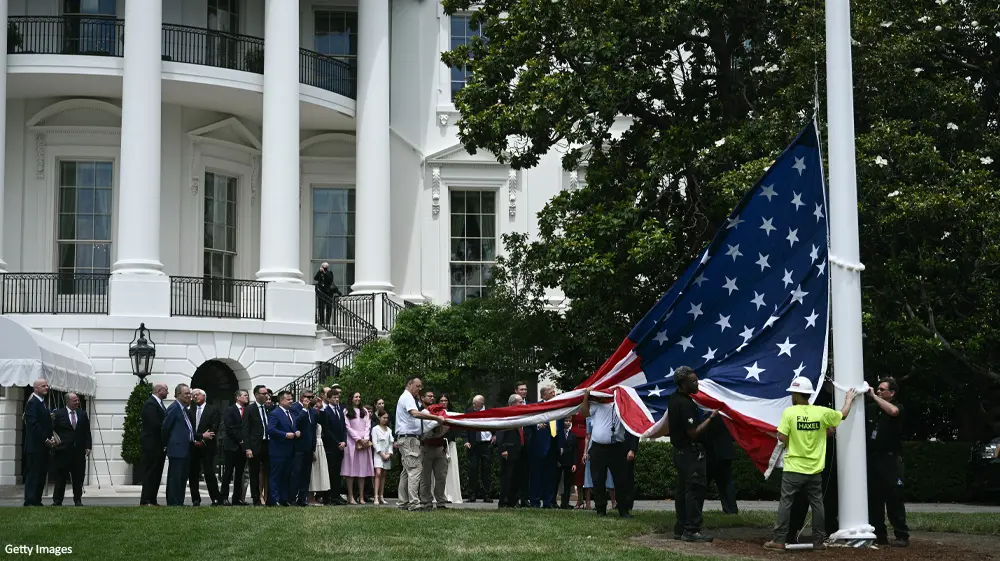 The car lots here keep there's up all the time. I haven't paid attention if they take them down during the hurricanes. White House weather I would say hey are up till they get torn or faded to need replaced.I would not want to have take down and put up that giant flag every day.