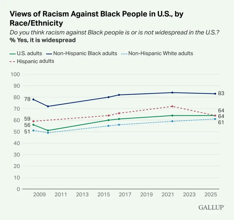 - Black Americans: The poll shows that an overwhelming majority of Black adults consistently report that racism is widespread. This finding is supported by a separate 2024 Pew Research Center study. It found three-quarters of Black adults said they have experienced racial discrimination. They documented it was either on a regular basis (13%) or from time to time (62%).