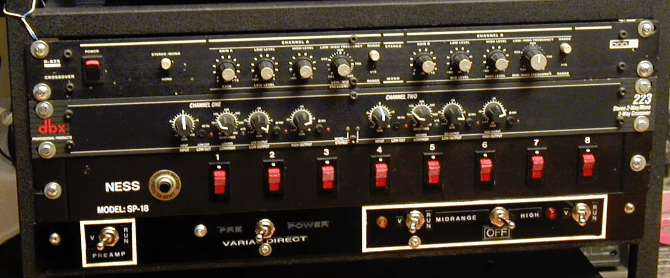 A Quintessence graphical equalizer (no photo), and a dbx 223/224 and a DOD SR835 pro electronic crossovers that I use for spectral filtering and distribution in my quad-amped custom music system.