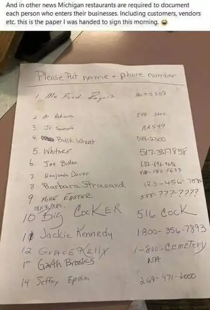 That should tell you just how repulsed the people are with the COVID Commie shit.O.K. So latest in, someone took a picture of one of those contact lists at a local restaurant. . . I thought, maybe you folks would like to see it. . . just so you have an idea of what is going on?