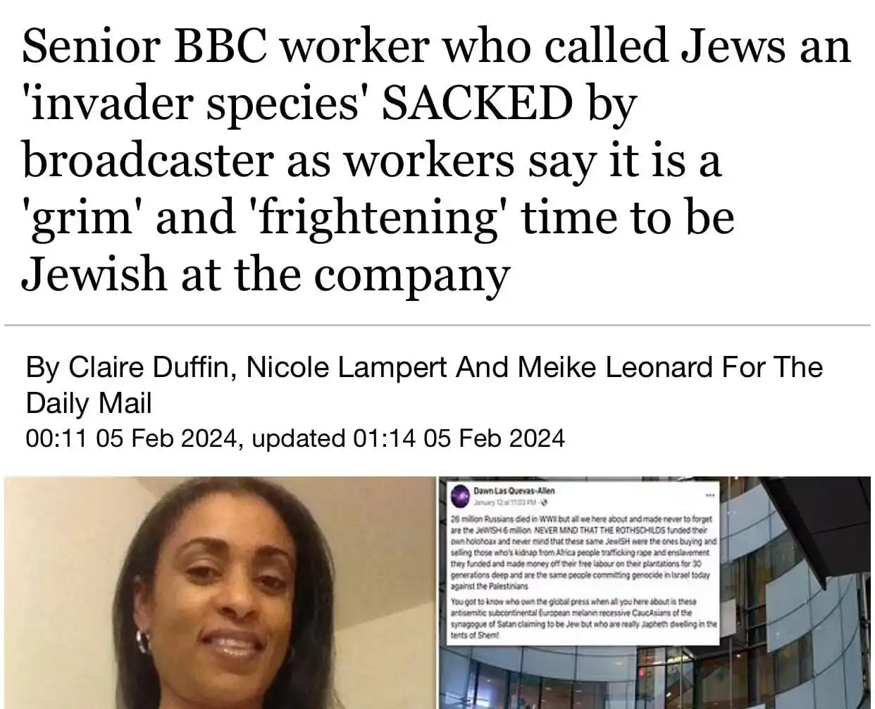 Senior BBC worker, Dawn Queva, who denied the Holocaust (laced with Nazi Antisemitic canards some old lies - something about "Rothschild"), mixing in that Khazar debunked myth - typically of absolving Nazis' crimes - branding Jewish people as supposed “Nazis”.