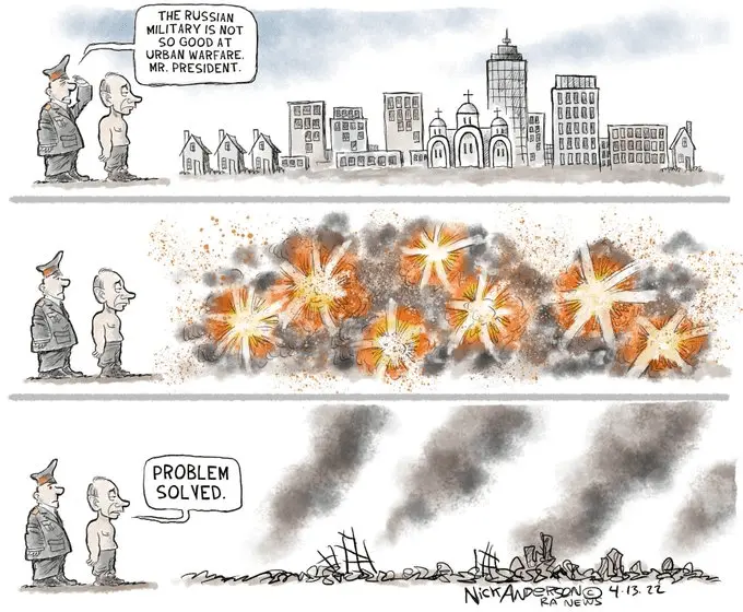 Sadly accurate...This is how Adolf Putin chooses to overcome his urban warfare weaknesses. Even Afghanistan kicked his ass.